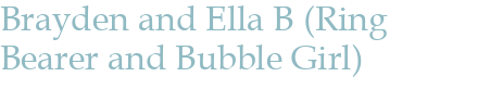 |  | Brayden is a nephew of the bride and Ella B (also known as the Queen) is a niece of the bride. Brayden loves playing imaginary games and making his own sandwiches. He's also the most hilarous and clever little boy on planet earth. EllaB's favorite food is pizzapizza, chickenfriesandmilk, or noduts (doughnuts) and her favorite thing is complimenting people.